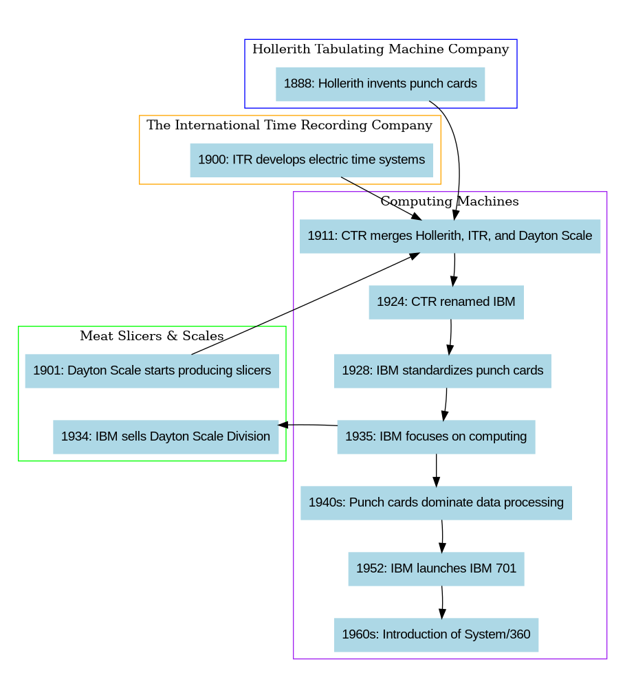 This piece ties into IBM’s broader historical journey, illustrated in the timeline below. The graph highlights key milestones in IBM’s evolution, from Hollerith’s invention of punch cards in 1888 to the renaming of the Computing-Tabulating-Recording Company (CTR) as International Business Machines in 1924. It also shows the company’s eventual focus on computing, culminating in groundbreaking innovations like the IBM 701 and the introduction of System/360 in the 1960s.