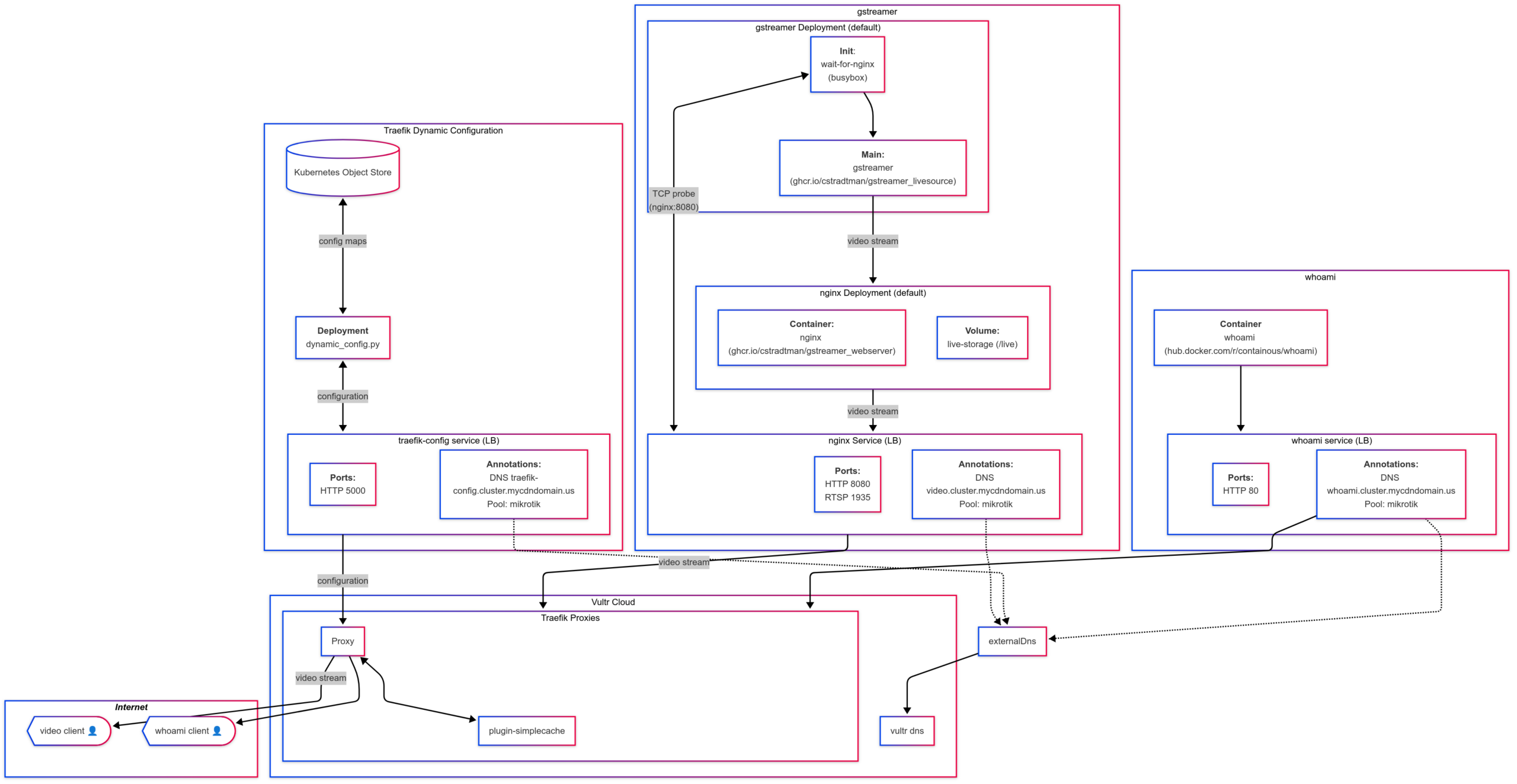 - Kubernetes Manifests: For shared configurations (like ConfigMaps) and workload definitions (for gstreamer, nginx, and whoami deployments).